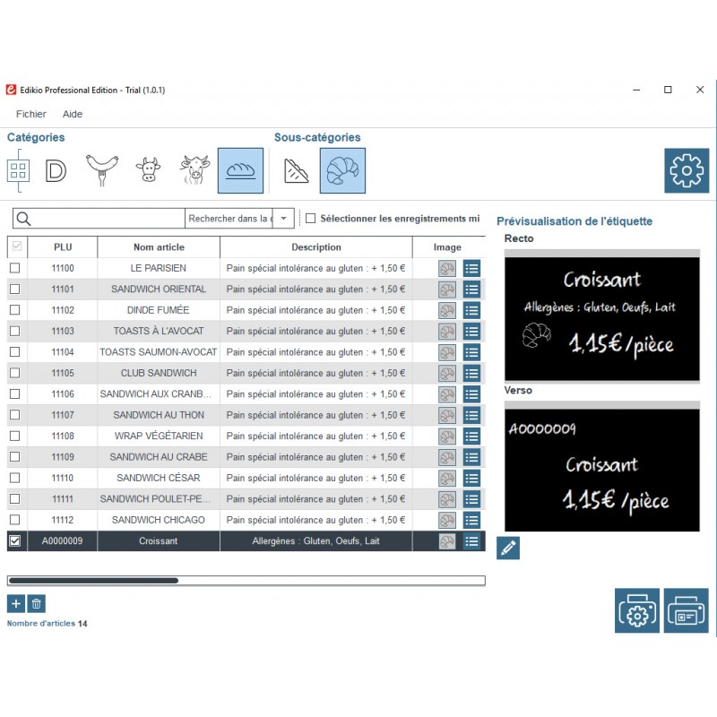 - Bibliothèque de modèles d'étiquettes par métiers (boissons, boucherie, boulangerie, fleuriste, fromagerie, poissonnerie, promotion, traiteur) et formats.